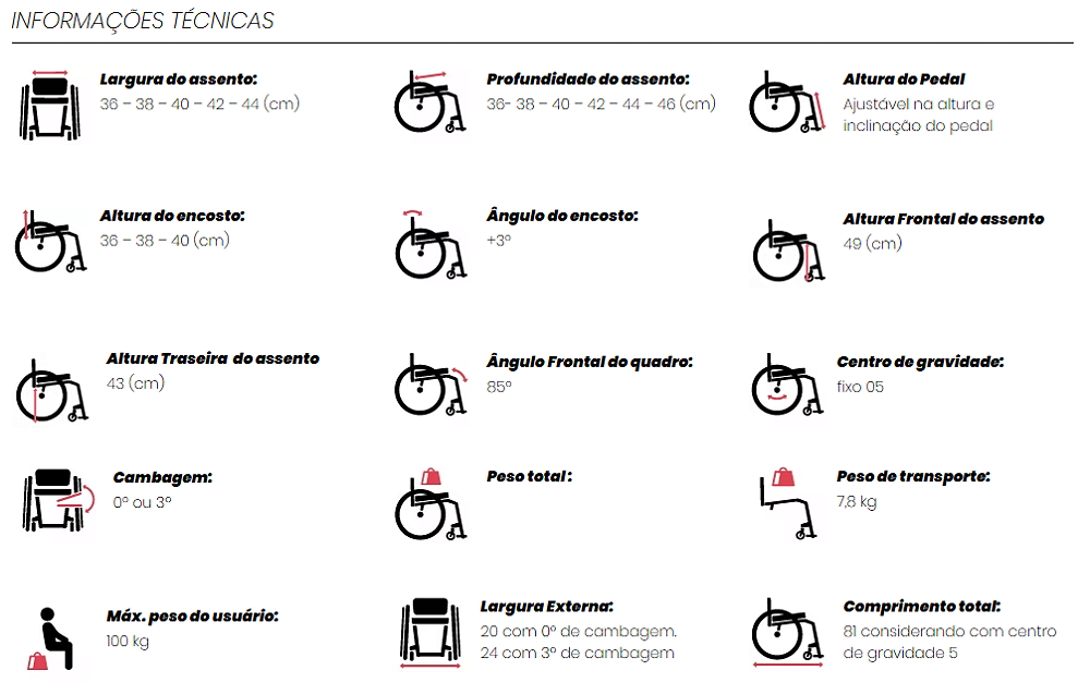 * Todas as medidas e pesos indicados são baseados na largura do assento de 40 cm e na profundidade do assento de 40 cm na configuração mais leve e compacta. O peso e as medidas podem mudar com as diferentes configurações!